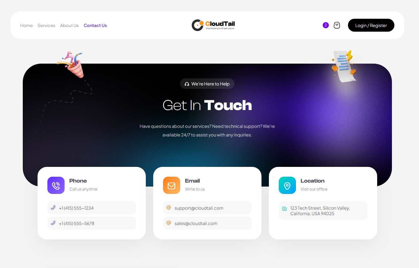 CloudTail is a modern, fully responsive, and feature-rich HTML template built with Tailwind CSS. Perfect for web hosting, domain registration, and technology companies.